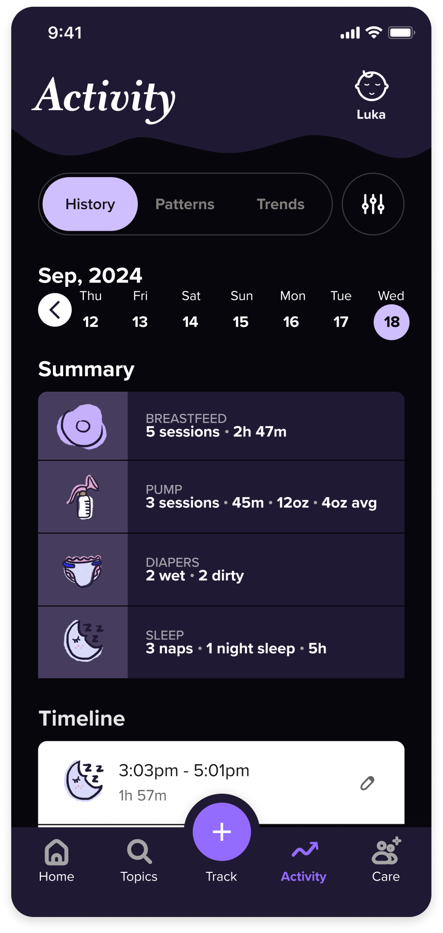 Essential for the 3 AM struggle. We designed a low-light UI to protect parents' eyes and prevent screen glare from waking the baby during night feeds.